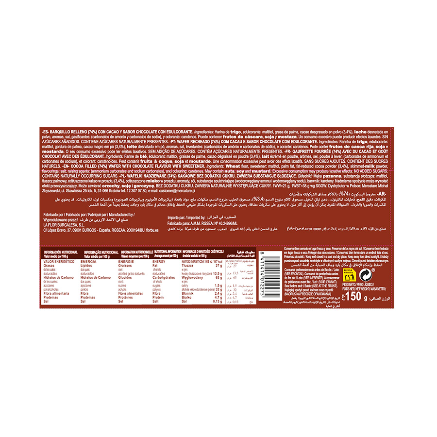 Disfruta del placer crujiente de la Galleta Wafle Florbú con su exquisito relleno de crema sabor chocolate. Creada en España para deleitarte sin remordimientos, estas dos capas de oblea crujiente no tienen azúcares añadidos, convirtiéndose en el postre o snack perfecto para cuidar tu figura y bienestar. Además de su irresistible sabor, cada galleta europea es una excelente fuente de fibra, contribuyendo a tu dieta diaria. Sabor, textura y bienestar en 150g. ¡Un capricho dulce y saludable!