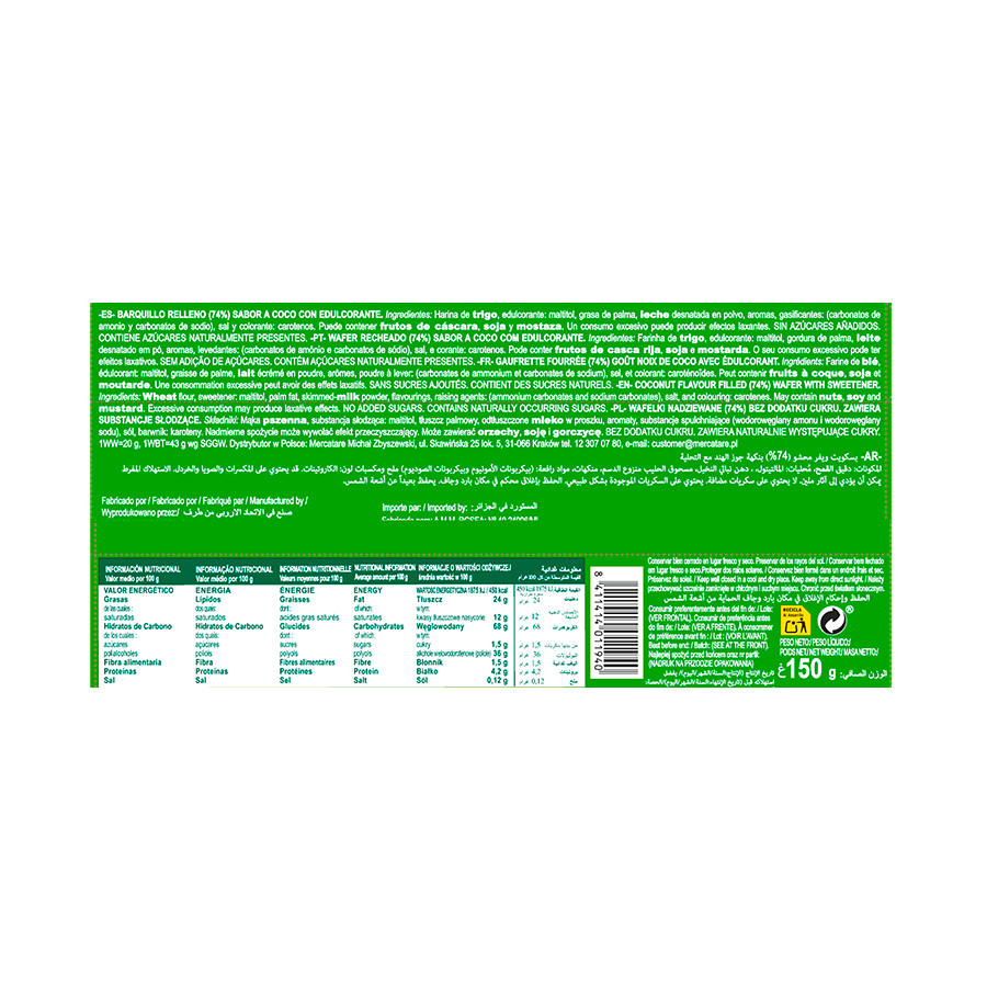 Deléitate con el sabor tropical. La Galleta Wafle Florbú de Coco combina dos crujientes capas de oblea con un delicioso relleno de crema de nata, todo sin azúcares añadidos. Importadas directamente de España, estas galletas europeas son el capricho perfecto para tu postre o snack. Te cuidan por dentro, ya que son una excelente fuente de fibra, y te ofrecen un sabor exótico y refrescante. ¡Elige el bienestar sin renunciar al placer!